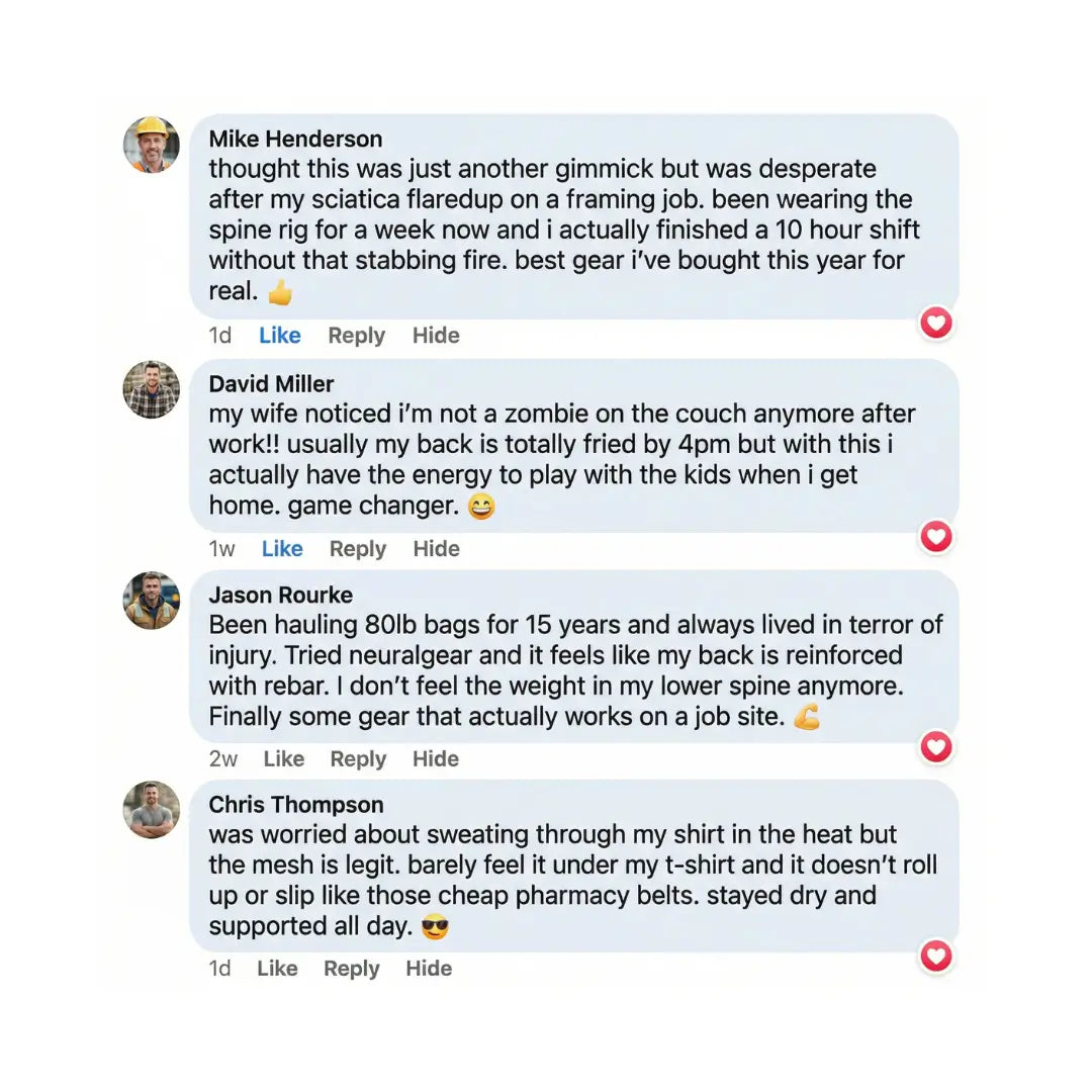"My physio told me I was one bad lift away from L4-L5 surgery. Since using the Spine Rig, I don’t wake up with that sickening stiffness anymore, and even the shooting nerve pain in my leg has basically vanished. It feels way more professional and secure than the flimsy pharmacy belt I was using before."